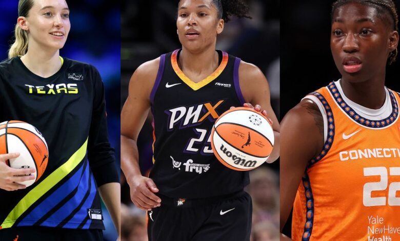 Queer bezkonkurenční hráči Paige Bueckers, Alyssa Thomas a Saniya Rivers.Ron Jenkins/Getty Images; Obrázky Chris Coduto/Getty; Hannah Foslien/Getty Images