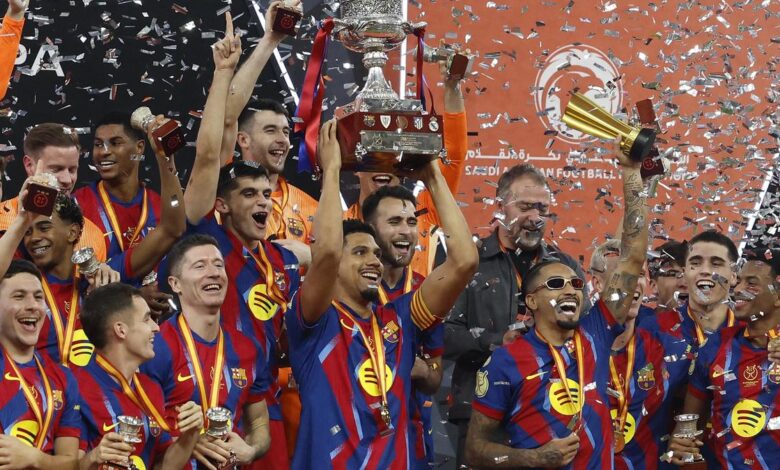 Hráči FC Barcelona slaví trofej po porážce Realu Madrid ve finále španělského Superpoháru v saúdskoarabské Džiddě 12. ledna 2026 | Fotografický kredit: Reuters