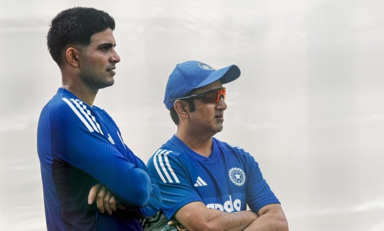 Kapitán Indie Shubman Gill, vlevo, a hlavní trenér Gautam Gambhir během tréninku. | Fotografický kredit: PTI