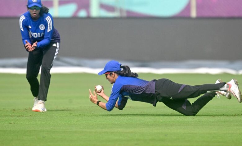 Indie Jemimah Rodrigues a Pratika Rawal během tréninku na mezinárodním kriketovém stadionu ACA-VDCA ve Visakhapatnam v sobotu. | Fotografický kredit: Kr Deepak