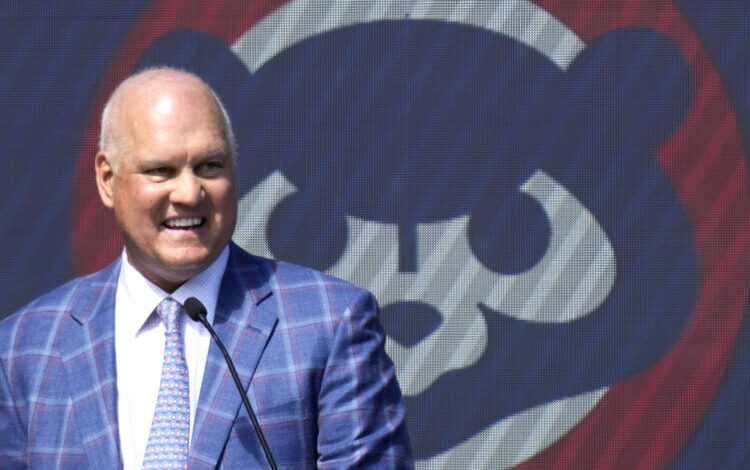 SOUBOR – Bývalý hráč Chicago Cubs Ryne Sandberg hovoří dříve, než tým představí sochu před baseballovou hrou proti New York Mets v Chicagu, neděle 23. června 2024. (AP Photo/Nam Y. Huh, soubor)