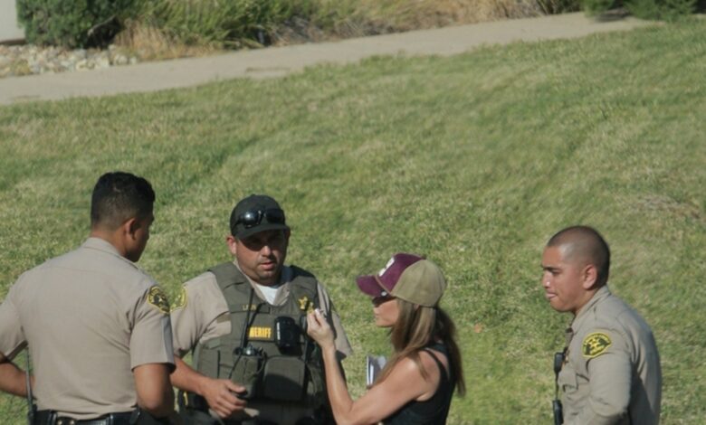 Denise Richardsová hovoří s policajty poté, co se pokusila dostat psa z domu odcizeného manžela