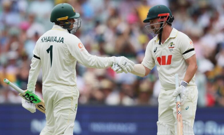 Australskému Travisovi Headovi blahopřeje Usman Khawaja v den 3 třetího testu Ashes v Adelaide 19. prosince 2025. | Fotografický kredit: AP