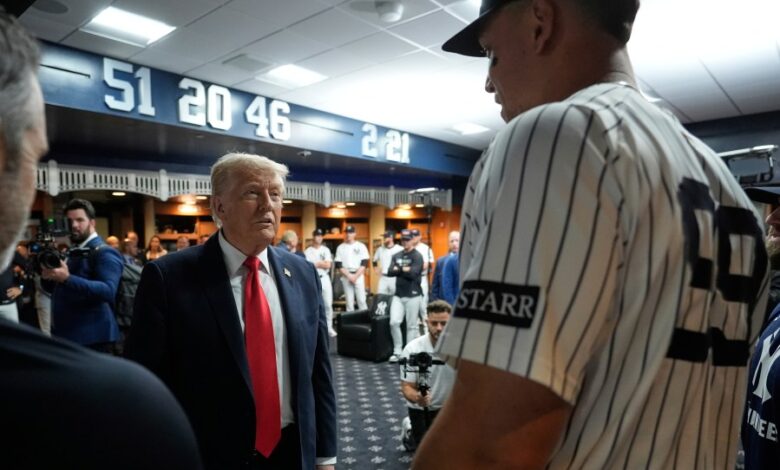 Trump se zastavil u klubu domácího týmu asi 15 minut před zápasem. Potřásl rukama s hráči a zaměstnanci týmu a hovořil o tom, že je po celá léta blízko s majitelem pozdního Yankees George Steinbrennera.