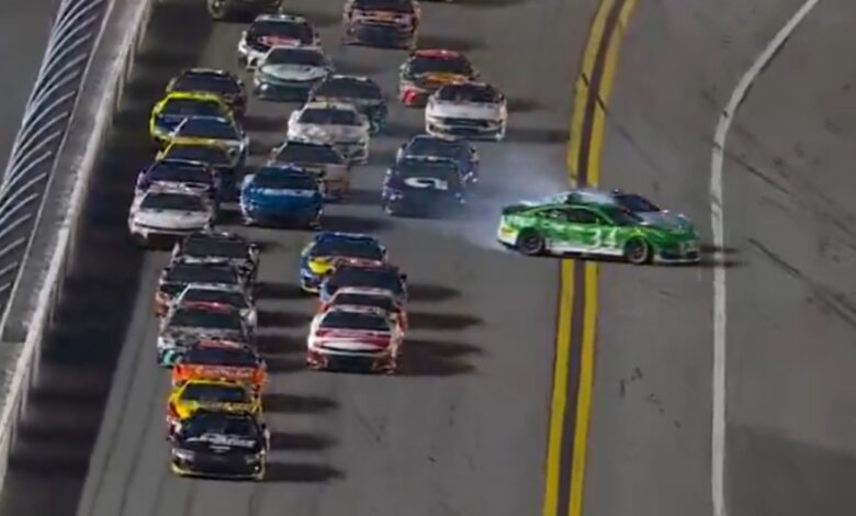 Tyler Reddick Wrecks po kontaktu s Toddem Gilliladem v Daytoně, staví č. 45 na opačném případě na pit road