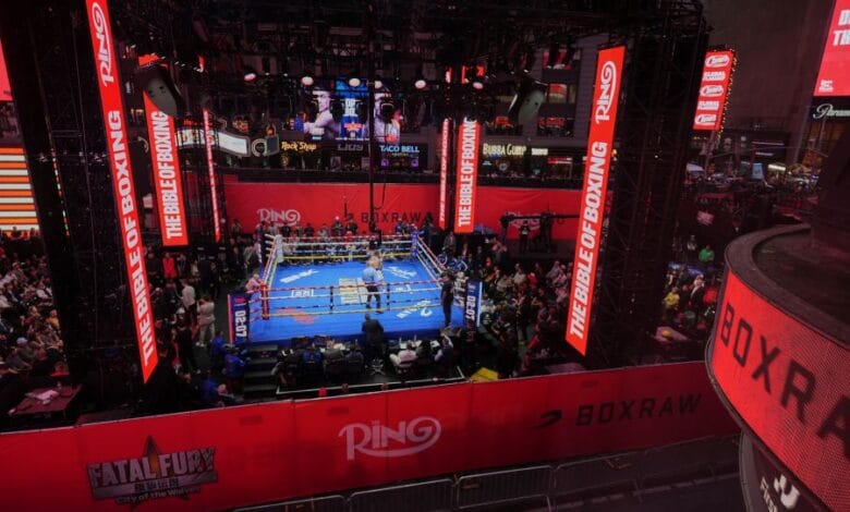 Boxeři, jako jsou Mike Tyson, Terence Crawford a Shakur Stevenson, měli sedadla před prstenem spolu s centrem Karl-Anthony Towns z New York Knicks a-toto je Times Square-několik lidí nosí kostýmy Elmo.