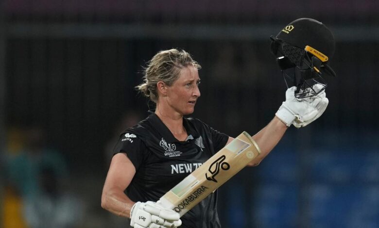 Kapitán Nového Zélandu Sophie Devine slaví své století během kriketového zápasu ženského kriketu ICC mezi novozélandským a Austrálií na kriketovém stadionu Holkar v Indore v Indii, ve středu 1. října 2025. | Foto kredit: AP