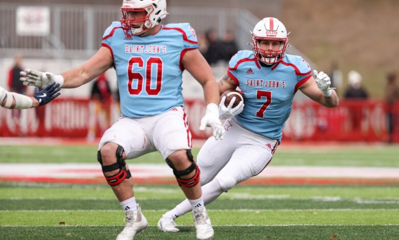 Juniorský quarterback St. John’s byl dobře chráněn svou útočnou linií, když házel na 294 yardů a pět touchdownů v jedné polovině práce na tahu č. 10 Johnnies‘ 70-21 MIAC v St. Scholastica před 5 529 fanoušky na stadionu Clemens.