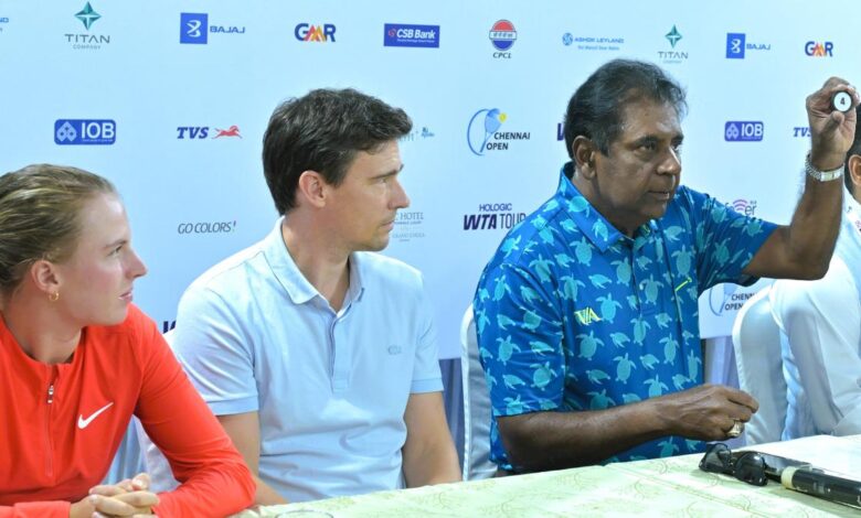 Při losování: Fruhvirtova, Alastair Garland MD, Octagon Tennis, Vijay Amritraj, prezident, TNTA, J. Meghanatha Reddy IAS, člen-tajemník, SDAT, a Shrivalli Bhamidipaty. | Fotografický kredit: R. Ravindran