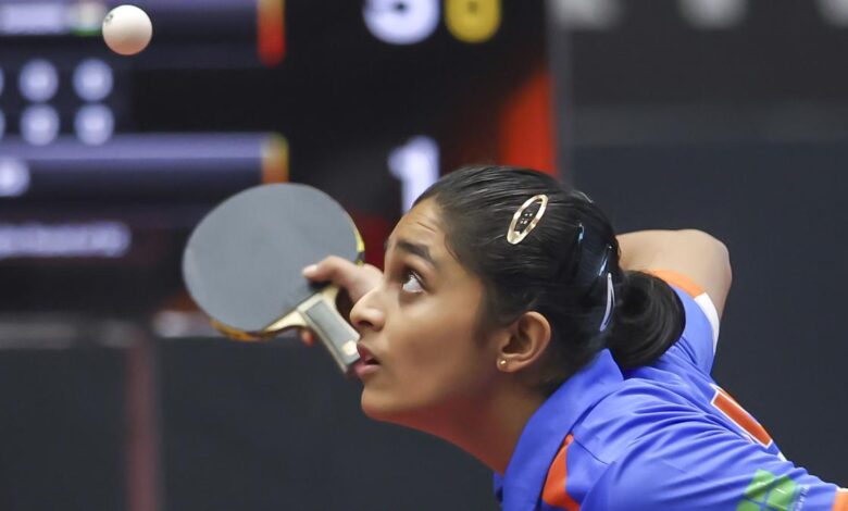 Hamsini v akci proti Yerin v mezinárodním hodnocení stolního tenisu série WTT Feeder ve Vadodara v pátek 9. ledna 2026. | Fotografický kredit: Zvláštní ujednání