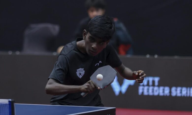 Senthil Kumar Mohan v akci proti Bodhisatvovi Chaudhurymu na turnaji WTT Feeder ve stolním tenisu ve Vadodara ve středu 7. ledna 2026. | Fotografický kredit: Zvláštní ujednání