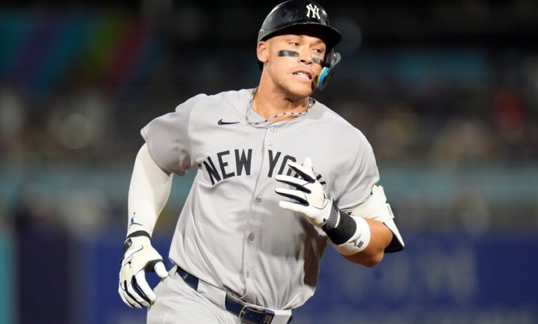 Giancarlo Stanton a Cody Bellinger oba zasáhli dva domácí běhy, Aaron Judge zahájil svou 40. sezónu a Yankees se rovnal franšízovému rekordu s devíti dlouhými kuličkami ve hře zpozdilo téměř dvě hodiny deštěm na začátku.