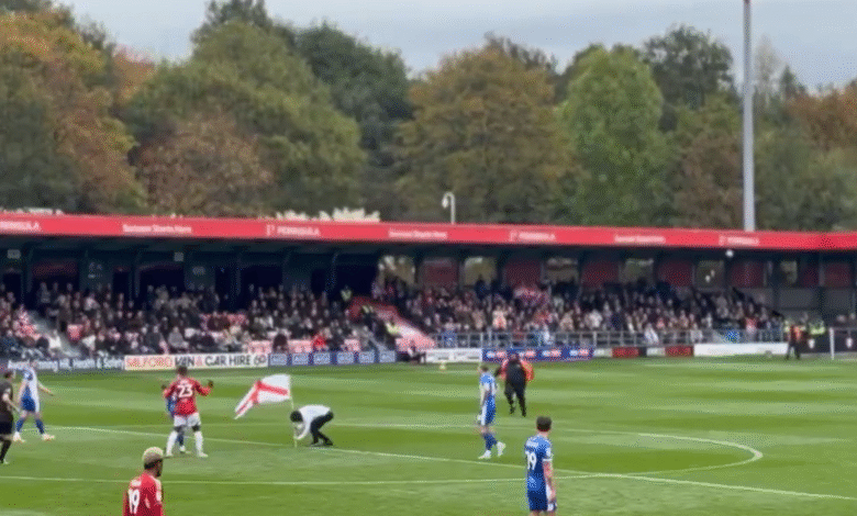 Zápas v Salfordu přerušili útočníci s anglickými vlajkami na protest proti Garymu Nevillovi