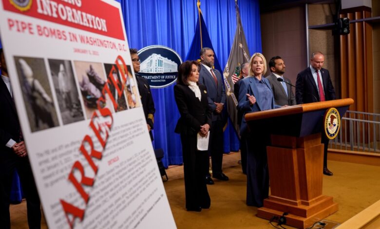Generální prokurátorka Pam Bondiová hovoří během tiskové konference o zatčení podezřelého z případu trubkové bomby ze 6. ledna.Andrew Harnik/Getty