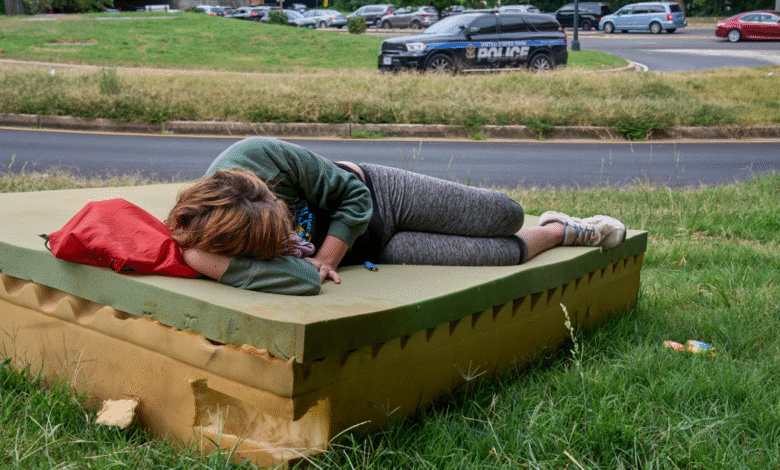 Stephanie W., 28 let, která je bez domova, spočívá na pěnové matraci, když policejní vozidlo Spojených států projíždí ve středu v severozápadním Washingtonu poblíž Kennedyho centra. Jacquelyn Martin/ap