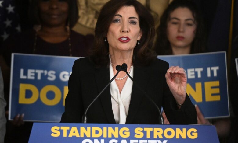 Guvernérka Kathy Hochul se připojuje k poskytovatelům služeb v oblasti domácího násilí, aby 14. dubna 2025 v New Yorku projednali newyorské zákony týkající se odhalování v kanceláři guvernéra.NDZ/STAR MAX/IPx/AP