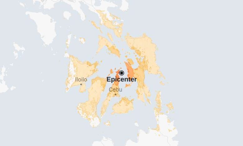 Poznámka: Mapa ukazuje oblast s intenzitou chvění 4 nebo vyšší, kterou USGS definuje jako „světlo“, i když zemětřesení může být pociťováno mimo zobrazené oblasti. Všechny časy na mapě jsou filipínské čas. The New York Times