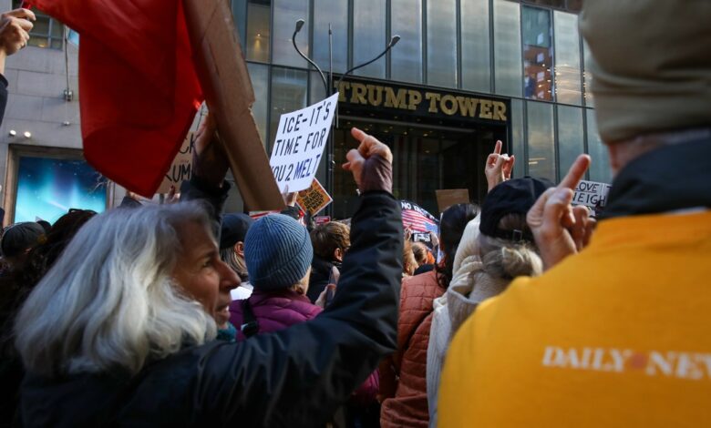 Demonstranti v neděli při průchodu Trump Tower na Páté Avenue na Manhattanu dávají prostředníček. Tisíce Newyorčanů protestovaly na památku smrti Renee Nicole Goodové, kterou minulý týden zabil agent ICE.
