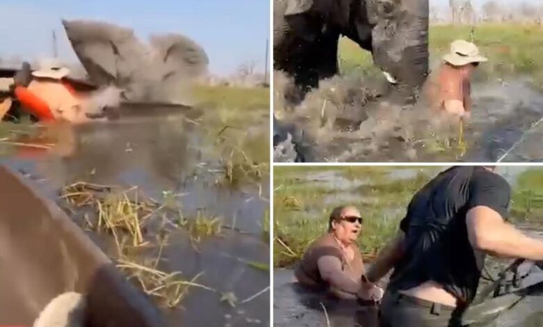 Fede-and-slon Mamma účtoval skupinu nedbalých turistů, kteří se unášeli příliš blízko ke svým dětem v mokřadech Botswany a pošlapali omylku, téměř ji utopili, ukazuje divoké záběry.