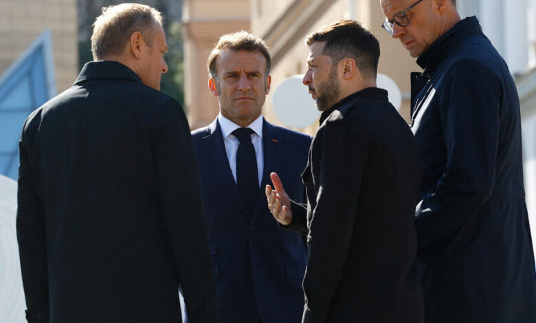 Vůdci Británie, Francie, Německa a Polska při své první společné návštěvě Ukrajiny v sobotu uvedli, že Rusko bude čelit „novým a masivním“ sankcím na své bankovní a energetické odvětví, pokud prezident Vladimir V. Putin odmítl souhlasit s úplným, bezpodmínečným 30denním oheňem.
