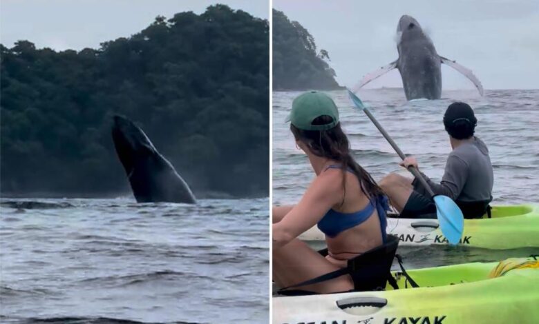 Zachytili video o podívané, protože jedna z velryb rozstříkla zpět do vody poblíž kajaků.