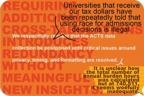 Ve veřejných komentářích argumentovali tím, že nové požadavky na sběr dat o přijímacím řízení jsou příliš vágní, požadují data, které instituce neshromažďují, a mohly by narušit soukromí studentů. Několik institucí uvedlo, že široce podporují transparentnost a federální sběr dat, ale že ministerstvo musí přehodnotit návrh na snížení administrativní zátěže vysokých škol a univerzit – zejména menších institucí s omezenou institucionální výzkumnou kapacitou.