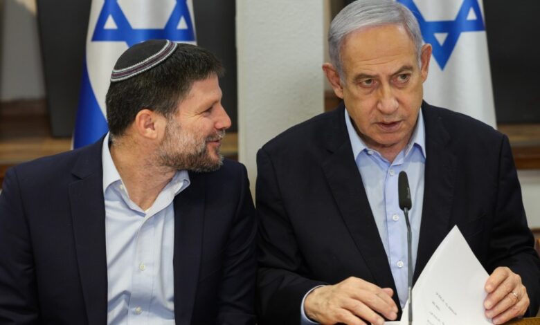 Izraelský premiér Benjamin Netanjahu (vpravo) hovoří s ministrem financí Bezalelem Smotrichem během týdenního zasedání vlády na ministerstvu obrany v Tel Avivu, v neděli 7. ledna 2024.Ronen Zvulun/AP