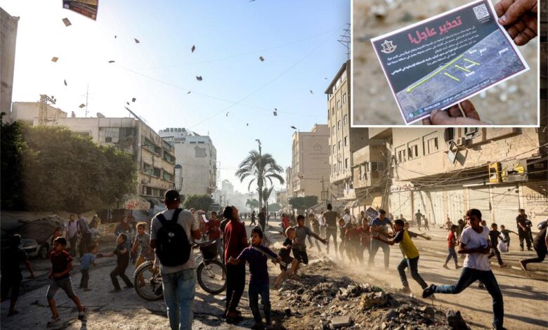 Palestinci žijící v troskách města Gazy byli v úterý bombardováni izraelskými letáky, kteří je nařídili, poté, co Izrael řekl, že se chystá vyhladit oblast při útoku na vyhlazení Hamasu.