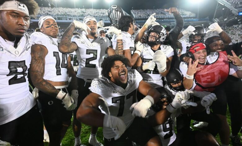 Oregon dominoval na dlouhé úseky ve státě Penn a ve čtvrtém čtvrtletí postavil vedení 17-3 s 12:25, než se Nittany Lions shromáždili. Kachny by se měly pohybovat se třemi týmy před nimi, které ztratily, ale jak daleko? Oregon měl minulý týden jediný hlas č. 1. Nejlépe hodnocený stát Ohio (52 hlasů na prvním místě minulý týden) vyhrál 24-6 ve Washingtonu, zatímco č. 2 Miami (7) byl nečinný.
