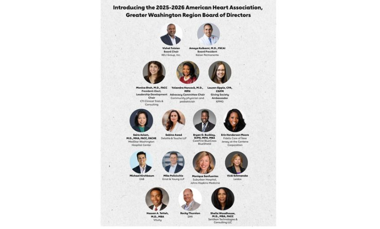 ARLINGTON, Va., 15. července 2025 – Americká asociace Heart Association, globální síla pro delší, zdravější životy, oznámila nové vedení a jmenování do své představenstva regionu Greater Washington pro fiskální rok 2025–26.