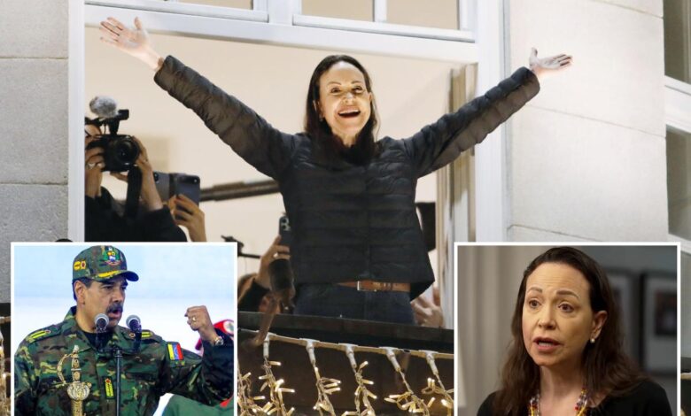 58letá aktivistka, která získala Nobelovu cenu za svou neúnavnou práci proti autoritářský prezident Nicolás Maduro – začala zrádnou cestu z předměstí Caracasu, kde se v pondělí odpoledne skrývala.