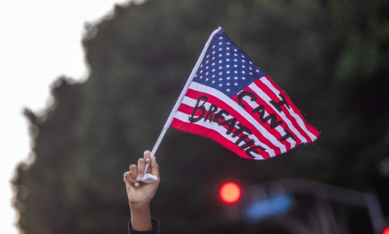 Demonstranti pochodují proti policejní brutalitě v Los Angeles v Kalifornii, po rozhodnutí v případech kolem policejního zabití Louisville zabití Breonny Taylor, 23. září 2020.APU Gomes/AFP/Getty