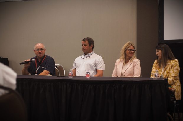 Zleva doprava: Andy Grover, výkonný ředitel Asociace správců školy Idaho; Kurt Liebich, prezident Státní rady pro vzdělávání Idaho; Debbie Critchfield, státní superintendent; a Quinn Perry, zástupce ředitele Asociace školních rad Idaho, diskutují o nedávné právních předpisech ovlivňujících veřejné školy 7. srpna 2025 během každoroční konference IASA vedení v Boise. (Kaeden Lincoln/ednews)