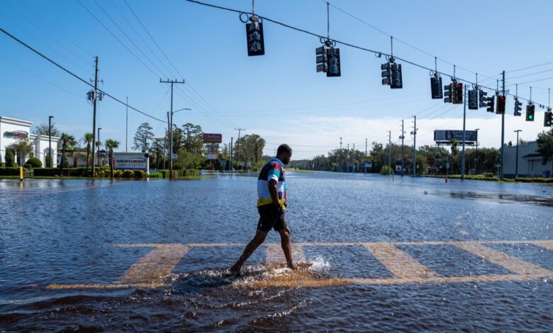 Osoba prochází zatopenou ulicí z vycházející řeky Anclote, když se region snaží 11. října 2024 zotavit z hurikánu Miltona v New Port Richey, FL.Spencer Platt/Getty