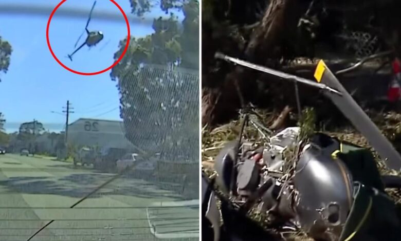 Děsivé záběry zachytily okamžik, než vrtulník propadl na zem, zabil muže a hospitalizoval teenagera v Jihozápad Sydney.