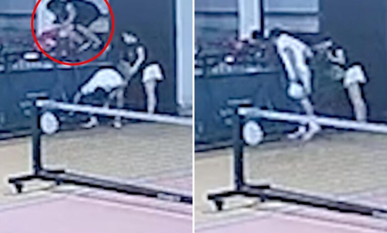 Muž, který dosud nebyl jmenován, je vidět, jak skáče přes bezpečnostní zábradlí, aby se pokusil získat míček, než se vrhl z třípatrového kurtu.