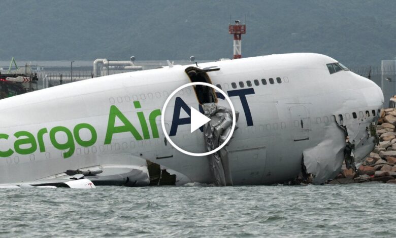 načteno nové video: Nákladní letadlo sklouzne z dráhy v Hong Kongu