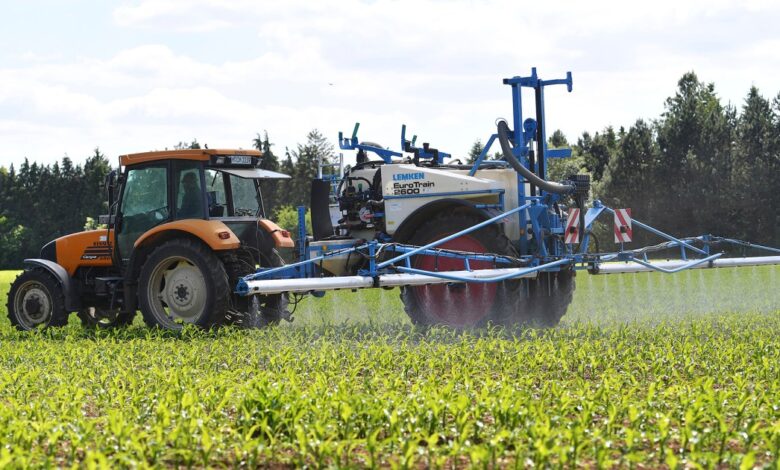 Farmář aplikuje glyfosát, kontroverzní chemickou látku používanou v Roundup, na plodiny v Bavorsku v Německu.Frank Hoermann/SVEN SIMON/picture-alliance/dpa/AP