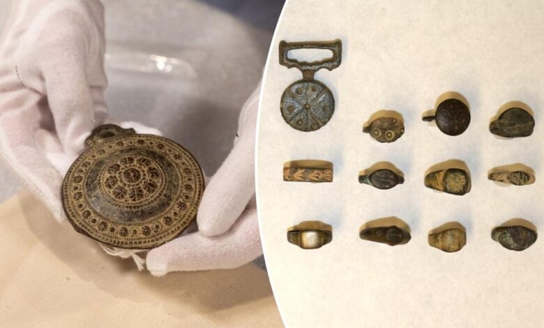Soubor zahrnoval 11 prstenů a dva medailony. Fotografie artefaktů ukazují, že byly složitě vyřezávané a stále se známkami patiny.