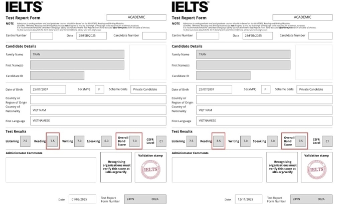 Dříve, 12. listopadu, obdrželo mnoho kandidátů ve Vietnamu e-maily od British Council a IDP, které spravují testy IELTS ve Vietnamu, oznamující změny skóre v poslechu a čtení. Ti, kterých se to týká, mohou požádat o vrácení celé částky (přes 4,6 milionu VND nebo 175 USD) nebo znovu absolvovat zkoušku zdarma s potvrzením požadovaným do května 2026.