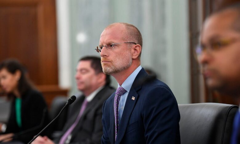 Brendan Carr poslouchá během slyšení výboru pro obchod senátu, vědy a dopravy, aby prozkoumal Federální komisi pro komunikaci pro Capitol Hill ve Washingtonu, 24. června 2020. Jonathan Newton/The Washington Post přes AP
