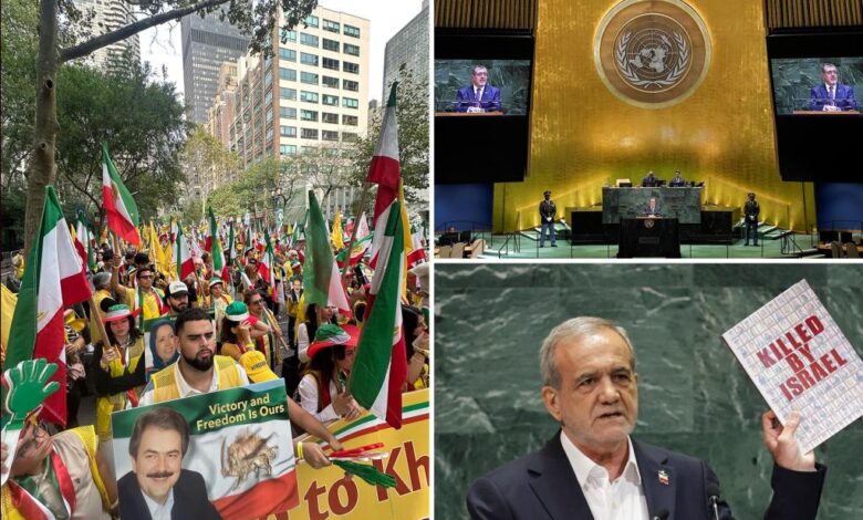 Ve středu se shromáždilo více než 2 000 lidí před ústředí OSN v New Yorku na protest Íránský prezident Masoud Pezeshkian Navštivte, s demonstračními demonstranty požadující změnu režimu.