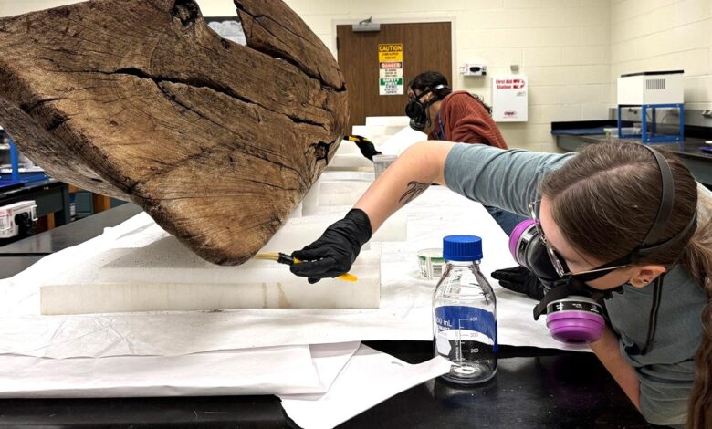 Úředníci na Floridě tvrdí, že vzácná dřevěná kánoe objevená poté, co hurikán Ian zůstane záhadou o tři roky později. (Florida divize historických zdrojů)
