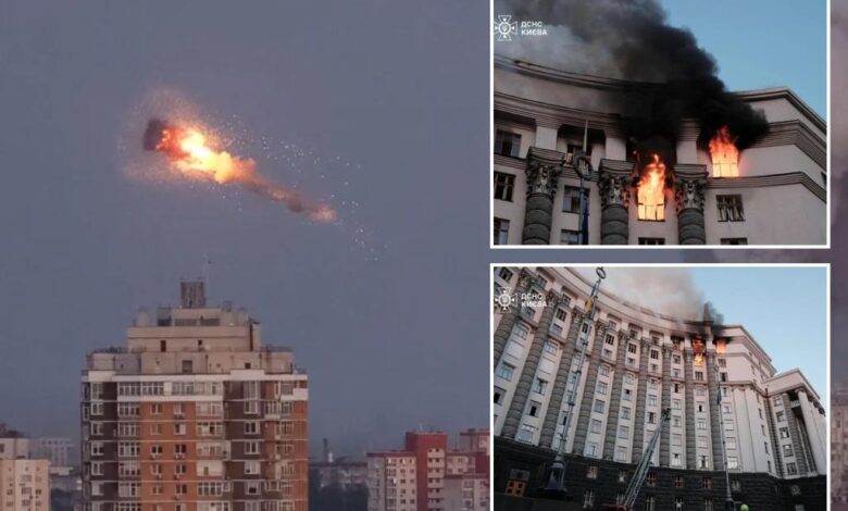 Rusko zasáhlo kapitál Ukrajiny nedělním dronem a raketami v největším leteckém útoku na zemi od začátku války, zabíjející nejméně dva lidi a zanechání kouře stoupajícího ze střechy klíčové vládní budovy.