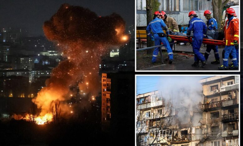 Plameny stoupaly nad různými místy v Kyjevě během noci, když zasáhlo několik vln ruských dronů a raketových útoků a fotografie také ukazovaly lidi schoulené v ulicích posetých sutinami před jejich obytnými domy.
