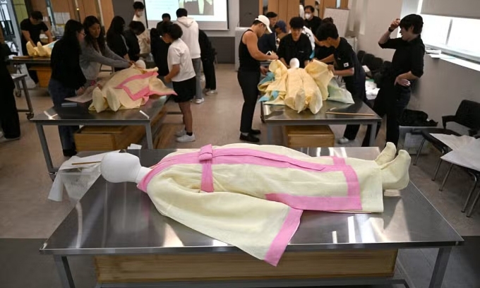 Studenti Busanského institutu vědy a technologie pečlivě zahalili figurínu do tradiční korejské pohřební látky, uhladili látku, jako by byla přes skutečnou kůži, a poté ji jemně položili do rakve.