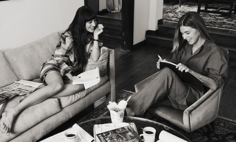 Je to tak úžasné, zvláštní, kouzelné malé kouzelné místo,“ Dakota Johnsonová říká. Šťastně se usadila v bohémských kancelářích TeaTime Pictures, produkční společnosti, kterou založila s bývalým šéfem Netflixu. Ro Donnelly v roce 2019. Plakáty pro klasiky jako Bezdechý a Harold a Maude lemovat stěny; nad jídelním stolem se třpytí disko koule; sbírka Spice Girl Barbies rozmarně leží na poličce v kuchyni. „Jsem prostě alergický na firemní kancelář a myslím, že být v domácím prostředí dělá pro kreativní lidi něco jiného.“