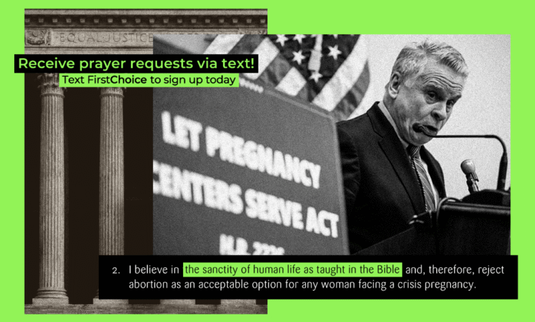 I když nemáte ponětí co je centrum krizového těhotenství, dárce webové stránky pro řetězec First Choice Women’s Resource Centers v severovýchodním New Jersey nabízí spoustu vodítek: Prominentní loga pro protipotratové skupiny Heartbeat International a CareNet. Banner na domovské stránce hlásající „Svatost lidského života neděle 2026“. An dohoda pro potenciální dobrovolníky, kde je uvedeno: „Otevřeně uznávám svou osobní víru v Ježíše Krista jako svého Pána a Spasitele“ a „(Odmítám) potrat jako přijatelnou možnost pro každou ženu.“