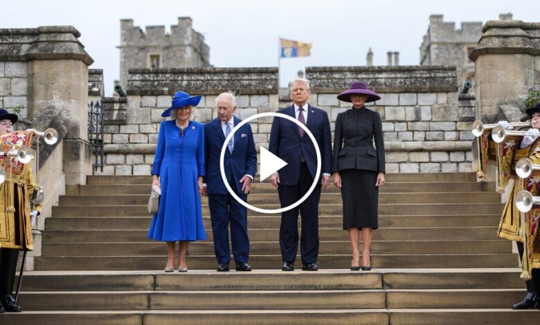 Prezident Trump a první dáma, Melania Trump, se v pátek setkali s britskou královskou rodinou na hradu Windsor, když se v centru Londýna shromáždili, aby protestovali proti jeho návštěvě.