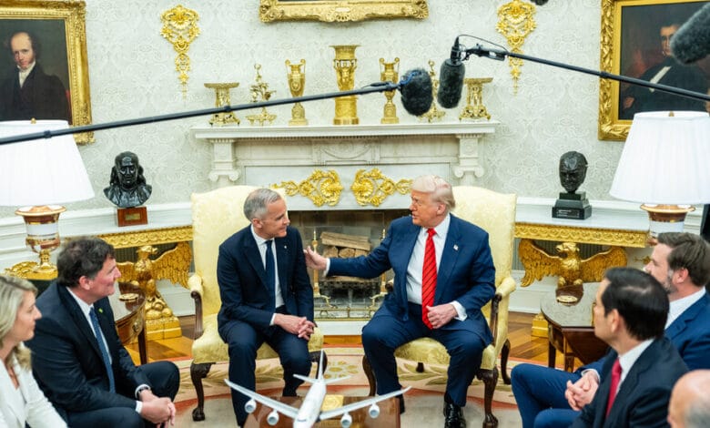 Byl to rozhodně odlišný tón než ten, který použil jen okamžiky dříve v příspěvku na pravdě sociální, když vystřelil Kanaďany jako spoustu freeloaderů, kteří nemohli přežít bez Spojených států. Zveřejnil to stejně jako nový kanadský premiér, Mark Carney, dorazil do Bílého domu.